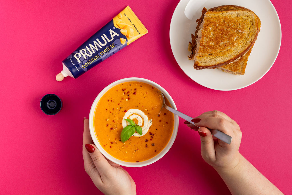 When it’s cold outside and you want something that feels like a hug in a bowl, this roasted red pepper and tomato soup with a squeezy Primula toastie has your back. Sweet, smoky veg blended with a creamy squeeze of Primula Original Cheese, plus a golden, gooey ham toastie that’s made for dunking. Simple, warming, and properly satisfying.
