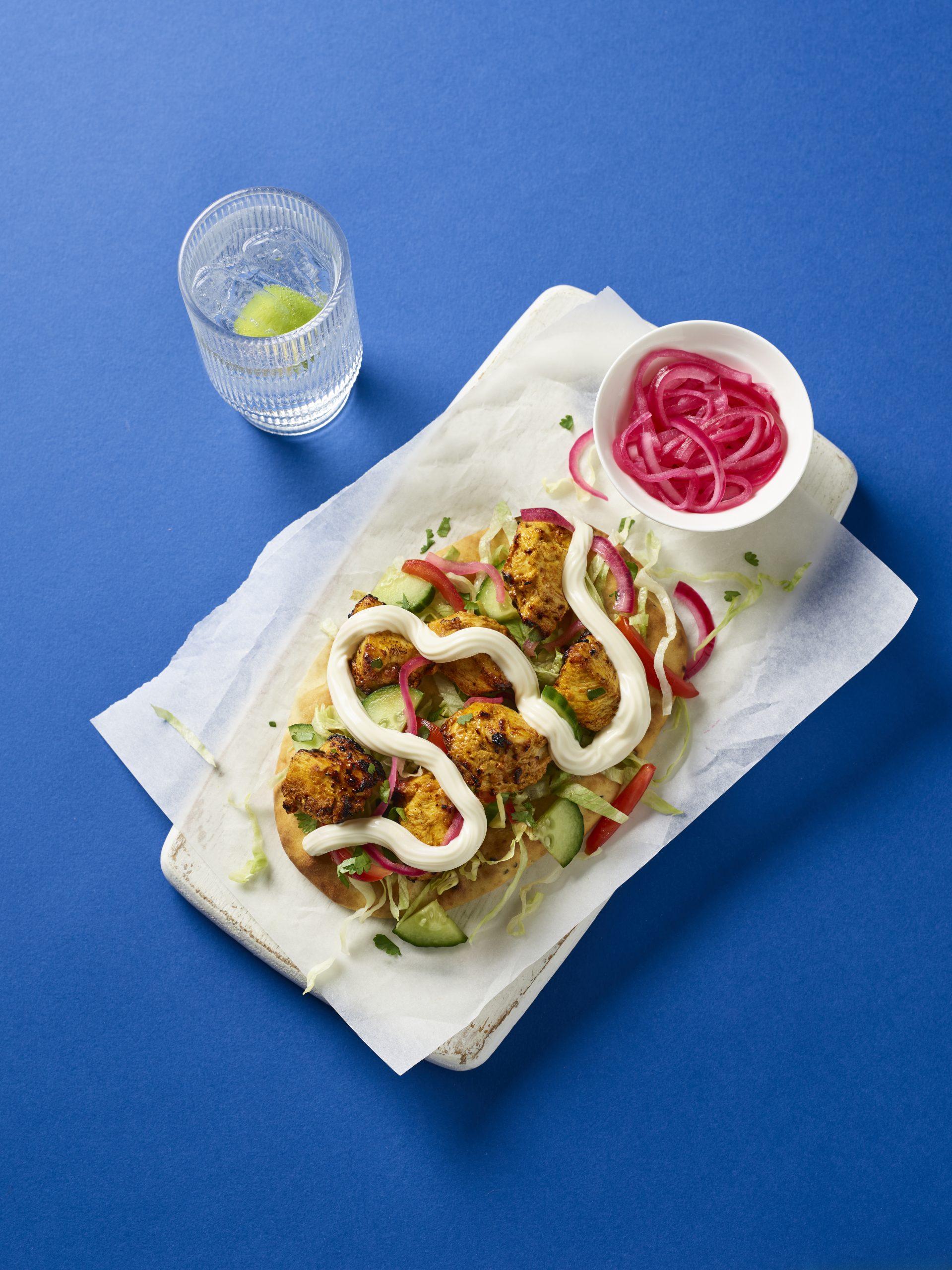 - Add the chicken tikka and pink pickled onion.